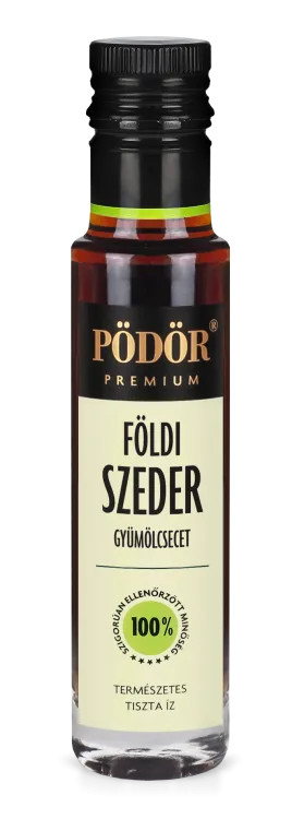 Már gyönyörű lila színe is elég lenne ahhoz, hogy a földiszeder gyümölcsecet a konyha igazi ékszere legyen. Ám a gourmet-t köztudottan a gyomra érdekli leginkább, ezért a Pödör gondoskodik róla, hogy gyümölcseceteinek utolsó cseppje is megfeleljen az ínyencek magas elvárásainak. A friss szemekből készült földiszeder gyümölcsecet intenzív gyümölcsös ízével hódít meg, és óhatatlanul kíváncsivá teszi az embert, hogy vajon hány lédús, kerek bogyót kellett felhasználni, hogy ennyire finom legyen. Ezt az ecetet is kizárólag a legjobb minőségű, gondosan szedett és facsart szederszemekből gyártják. Az első fermentációs folyamat során alkohol képződik, ami a másodikban ecetté alakul. A Pödörnél ez a folyamat szigorú minőségi ellenőrzés mellett megy végbe.